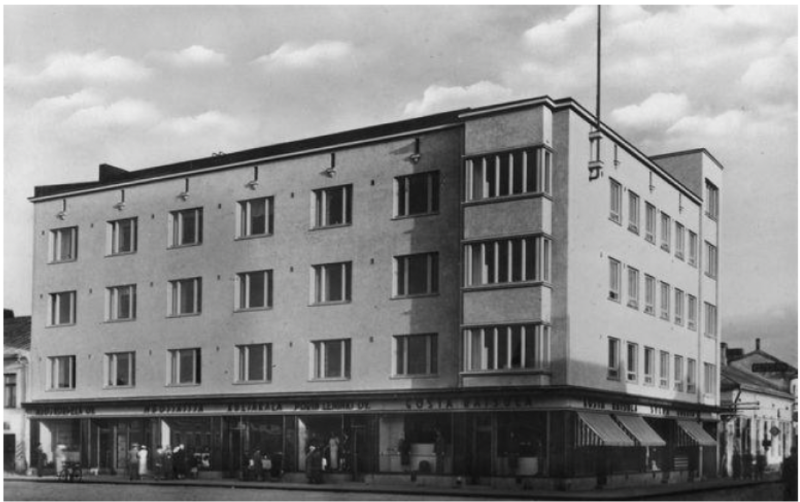 Satakunnan museon arkistoista käy ilmi, että Eteläkauppatori 4:ssa sijaitsi 1900-luvun alussa puinen, yksikerroksinen liikerakennus. Liiketoimintaa kiinteistössä harjoittivat tuolloin vaatetusliike Gösta Wilsson sekä Sjöbergin kelloliike. Samaan aikaan trendikäs arkkitehtuurin tyylisuunta, funktionalismi, siivitti tiensä Euroopasta Suomeen sellaisten arkkitehtien, kuten Alvar Aallon, mukana. Funktionalismi, “funkkis”, tuli pikaisesti suosituksi käytännöllisten pohjoismaalaisten keskuudessa. Tyylisuunnalle ominaista olivat yksinkertaiset, laatikkomaiset muodot, tasakatot sekä suuret ja tasaiset lasi- ja rappauspinnat. Funkkis-arkkitehtejä viehätti teräsbetonin käytännöllisyys ja muovattavuus, ja sen käyttö rakennusmateriaalina popularisoitui tuolloin. Niinpä puinen rakennus osoitteessa Eteläkauppatori 4 purettiin modernin uudisrakennuksen tieltä.