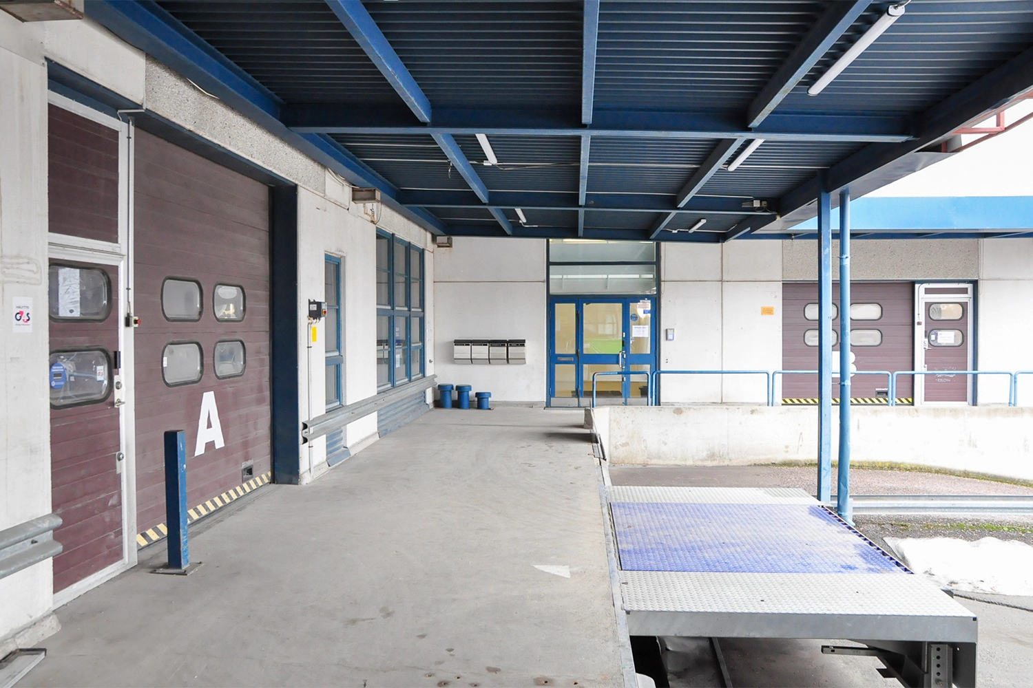 Autohallissa ja pihalla pysäköintipaikkoja henkilökunnalle.